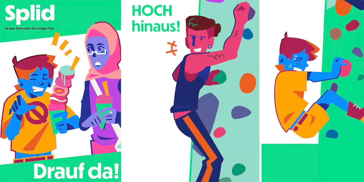 Für die App Splid entstanden charakterstarke Vektorillustrationen, die eine junge, internationale Berliner Zielgruppe widerspiegeln. Wichtig sind hier die besonderen gestalterischen Ansätze, die Farbwahl und auch eine beeindruckende Balance zwischen persönlicher Handschrift und den Anforderungen der Marke.