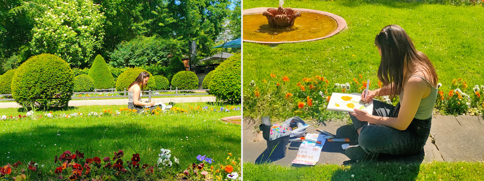 Generell könnt ihr mit euren bevorzugten Materialien arbeiten. Empfehlenswert sind ein Aquarell-Skizzenbuch mit feinkörnigem Papier mind. 200g im Querformat, Bleistifte in verschiedenen Härten mit Radierkappe, wasserfeste Fineliner und Faserstifte mit Pinselspitze, Aquarellstifte, Buntstifte, Aquarellkasten mit verschiedenen Pinseln. Sehr hilfreich sind auch Wassertankpinsel, eine Sitzunterlage oder ein Klapphocker.